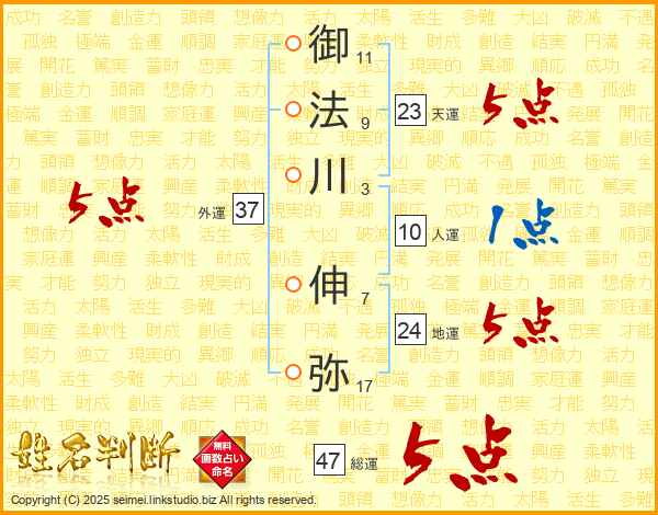 御(11画)法(9画)川(3画) 伸(7画)弥(17画)