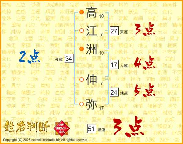 高(10画)江(7画)洲(10画) 伸(7画)弥(17画)