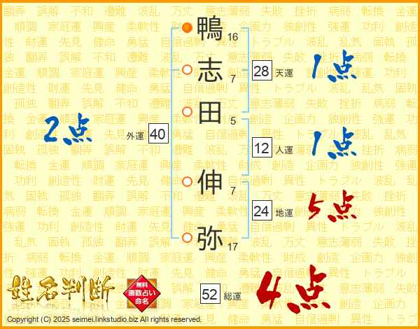 鴨志田伸弥さんの総運は52画の4点!
