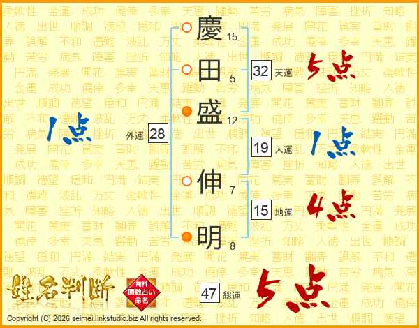 慶(15画)田(5画)盛(12画) 伸(7画)明(8画)