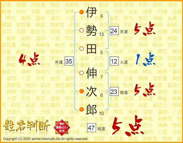 伊(6画)勢(13画)田(5画) 伸(7画)次(6画)郎(10画)