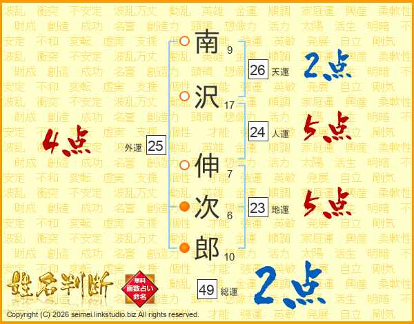 南(9画)沢(17画) 伸(7画)次(6画)郎(10画)