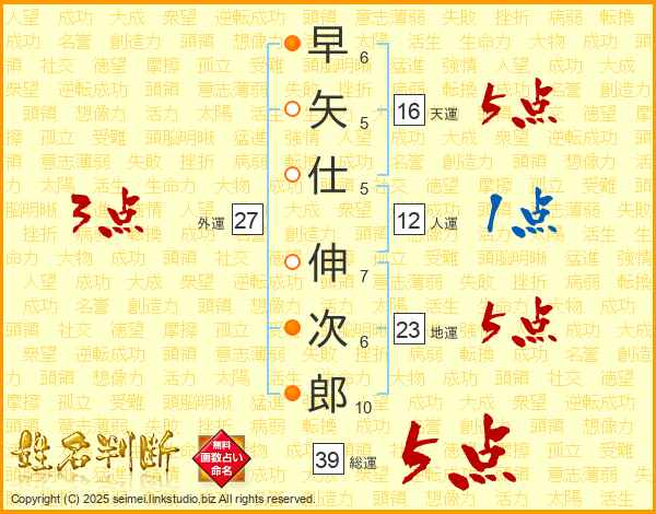 早(6画)矢(5画)仕(5画) 伸(7画)次(6画)郎(10画)