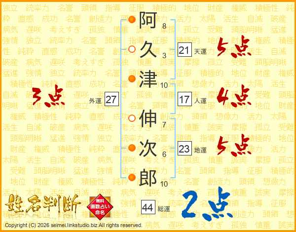 阿(8画)久(3画)津(10画) 伸(7画)次(6画)郎(10画)