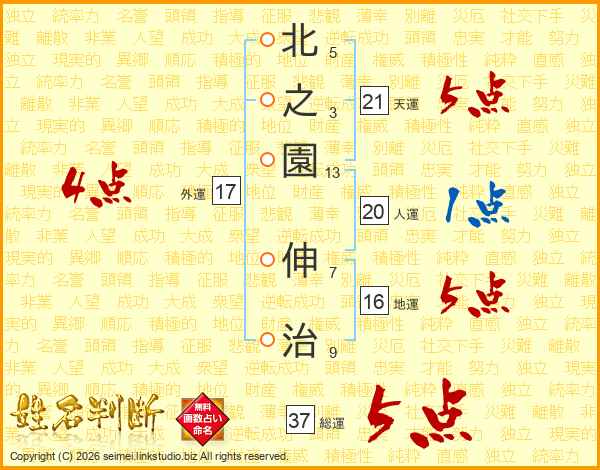 北(5画)之(3画)園(13画) 伸(7画)治(9画)