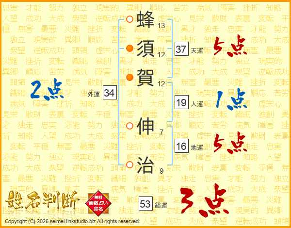 蜂(13画)須(12画)賀(12画) 伸(7画)治(9画)