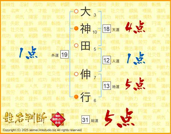 大(3画)神(10画)田(5画) 伸(7画)行(6画)