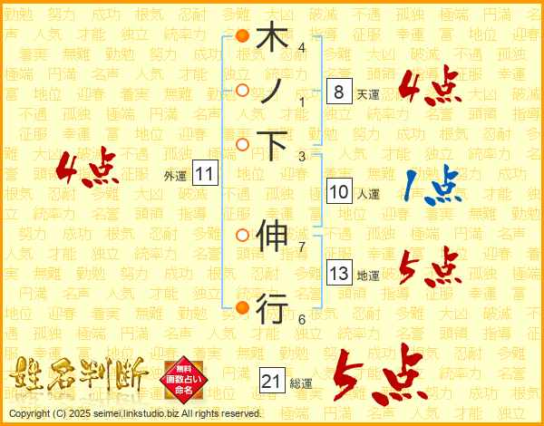 木(4画)ノ(1画)下(3画) 伸(7画)行(6画)