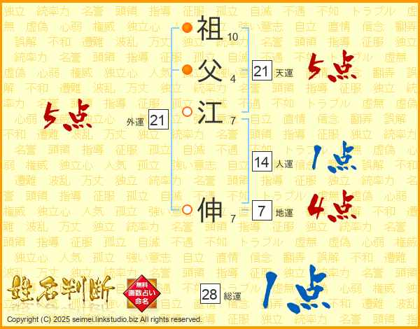 家系が持つ宿命的な運勢を表します。祖先から受け継いだ苗字ですので自分の力が及びません。家柄を象徴します。苗字の合計画数。