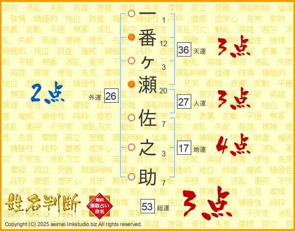 一番ヶ瀬佐之助さんの総運は53画の3点!