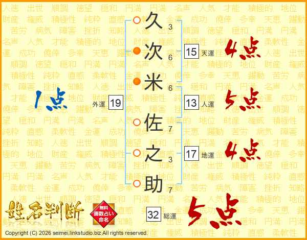 久(3画)次(6画)米(6画) 佐(7画)之(3画)助(7画)