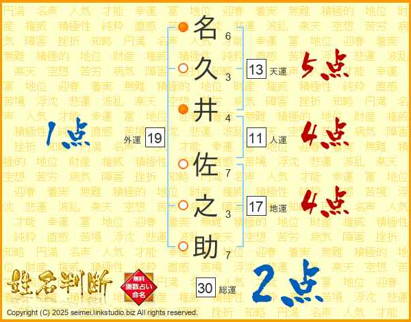 名(6画)久(3画)井(4画) 佐(7画)之(3画)助(7画)
