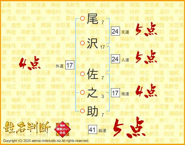 尾(7画)沢(17画) 佐(7画)之(3画)助(7画)