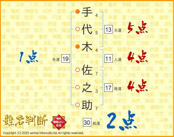 手(4画)代(5画)木(4画) 佐(7画)之(3画)助(7画)