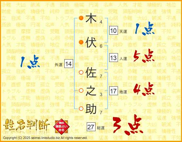 木(4画)伏(6画) 佐(7画)之(3画)助(7画)