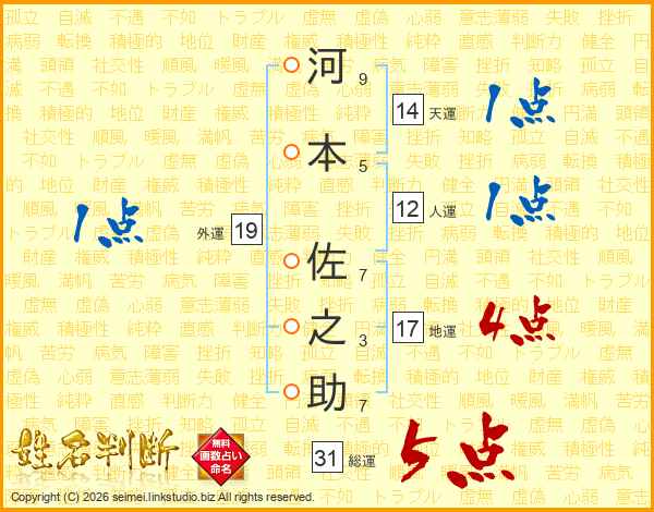 河(9画)本(5画) 佐(7画)之(3画)助(7画)