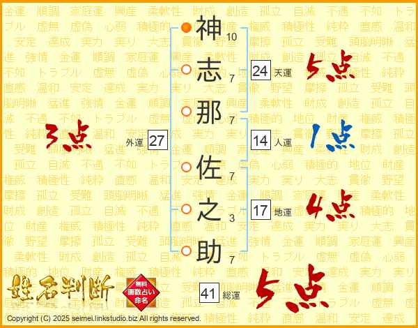 神(10画)志(7画)那(7画) 佐(7画)之(3画)助(7画)