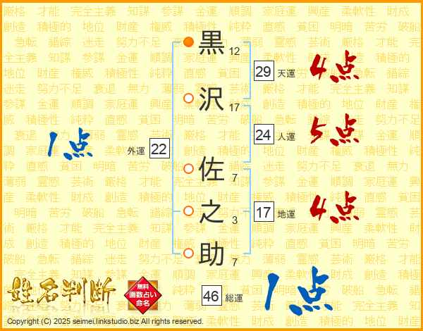 黒(12画)沢(17画) 佐(7画)之(3画)助(7画)