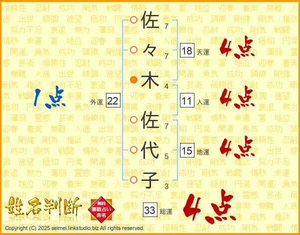 佐(7画)々(7画)木(4画) 佐(7画)代(5画)子(3画)