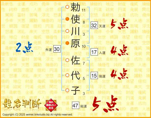 勅(11画)使(8画)川(3画)原(10画) 佐(7画)代(5画)子(3画)