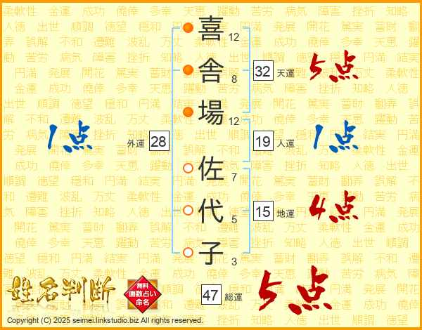 喜(12画)舎(8画)場(12画) 佐(7画)代(5画)子(3画)