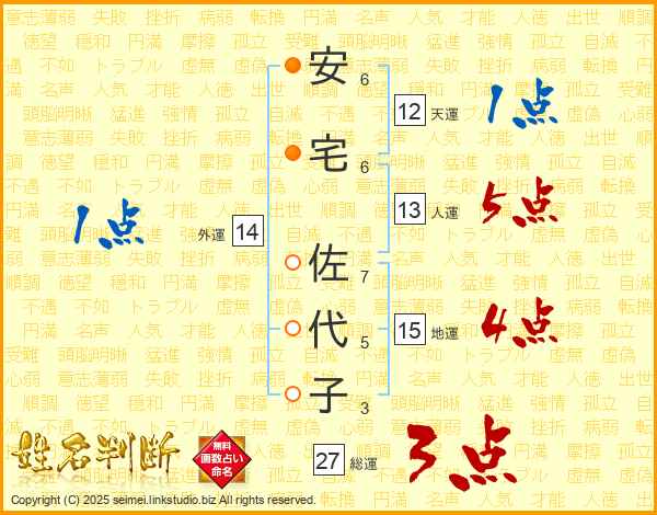 安(6画)宅(6画) 佐(7画)代(5画)子(3画)
