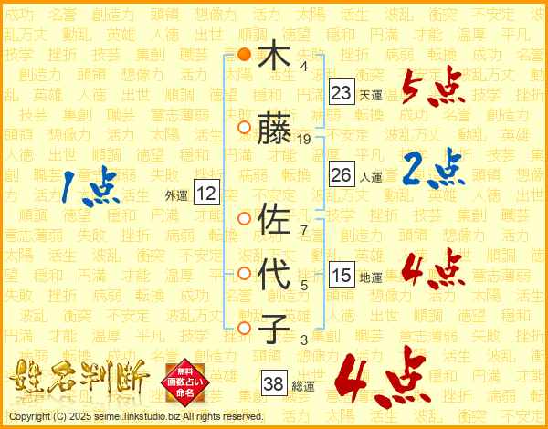 木(4画)藤(19画) 佐(7画)代(5画)子(3画)
