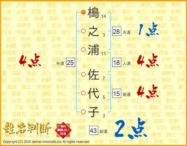 槝(14画)之(3画)浦(11画) 佐(7画)代(5画)子(3画)