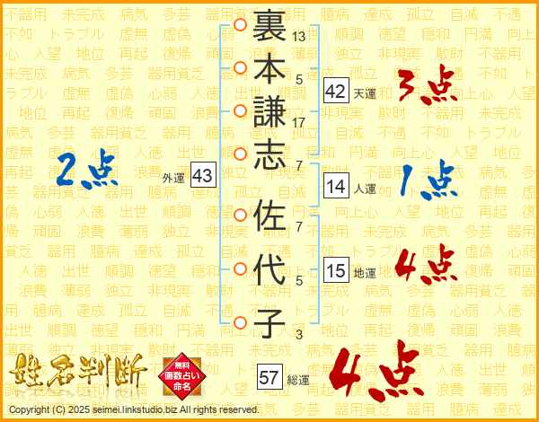 裏(13画)本(5画)謙(17画)志(7画) 佐(7画)代(5画)子(3画)