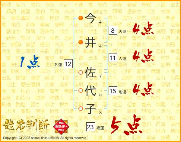 今(4画)井(4画) 佐(7画)代(5画)子(3画)