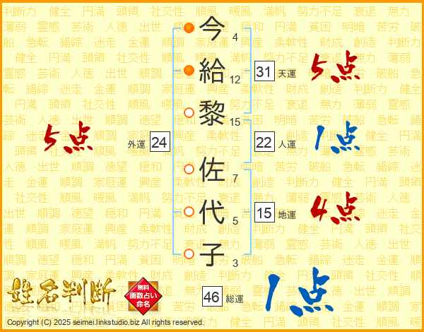 今(4画)給(12画)黎(15画) 佐(7画)代(5画)子(3画)