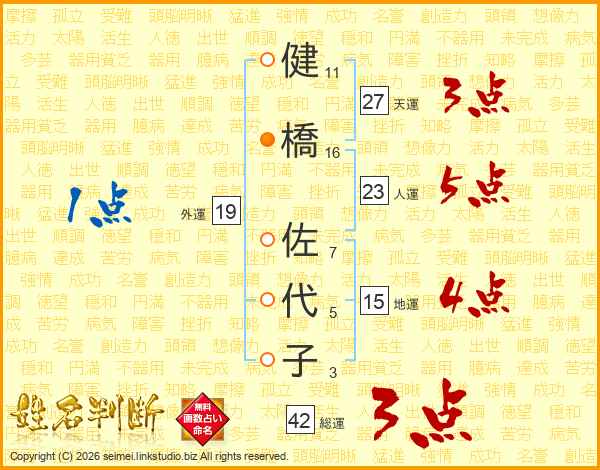 健(11画)橋(16画) 佐(7画)代(5画)子(3画)