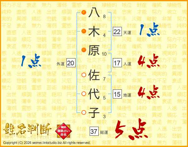 八木原佐代子さんの総運は37画の5点!