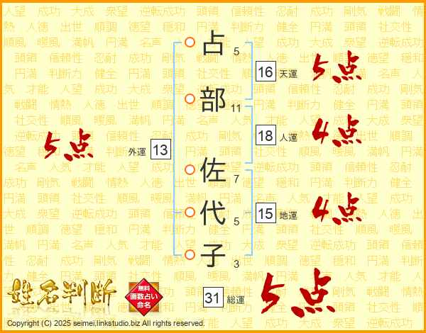 占(5画)部(11画) 佐(7画)代(5画)子(3画)