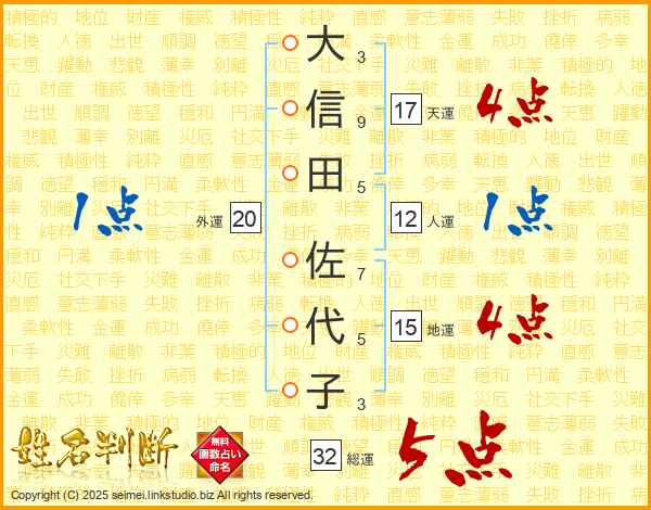 大(3画)信(9画)田(5画) 佐(7画)代(5画)子(3画)