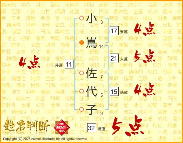 小(3画)嶌(14画) 佐(7画)代(5画)子(3画)