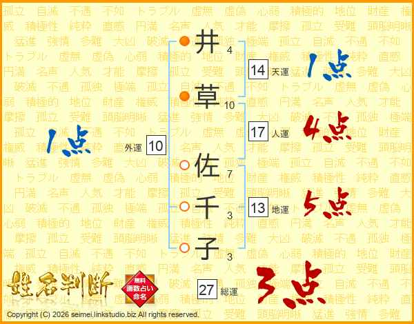 井(4画)草(10画) 佐(7画)千(3画)子(3画)