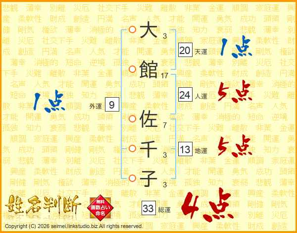 大(3画)館(17画) 佐(7画)千(3画)子(3画)