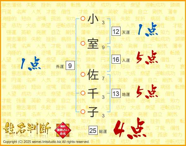 小(3画)室(9画) 佐(7画)千(3画)子(3画)
