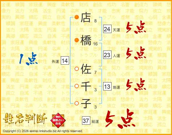 店(8画)橋(16画) 佐(7画)千(3画)子(3画)