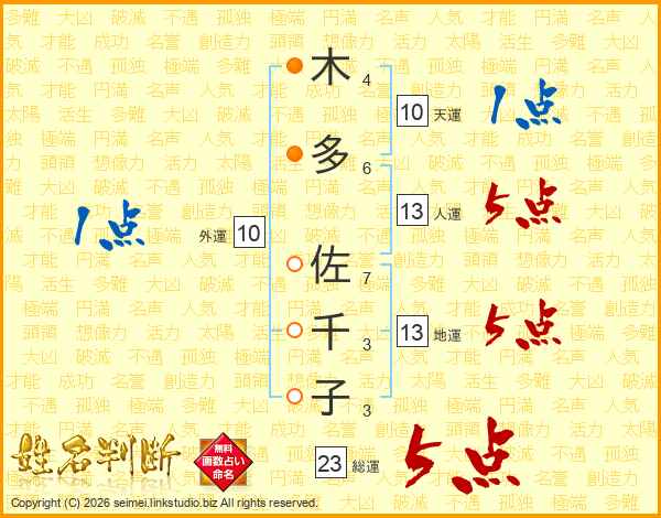 木多佐千子さんの総運は23画の5点!