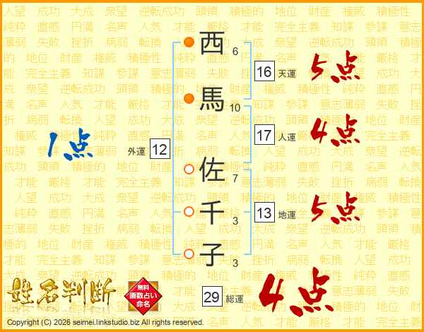 西(6画)馬(10画) 佐(7画)千(3画)子(3画)