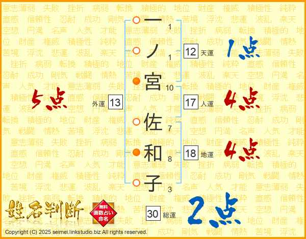 一(1画)ノ(1画)宮(10画) 佐(7画)和(8画)子(3画)