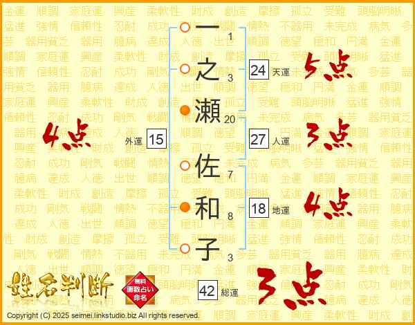 一(1画)之(3画)瀬(20画) 佐(7画)和(8画)子(3画)