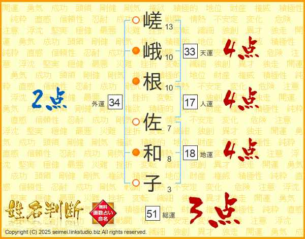 嵯(13画)峨(10画)根(10画) 佐(7画)和(8画)子(3画)