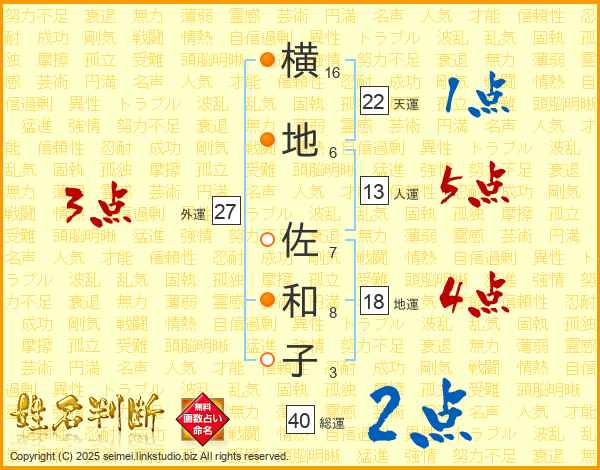 横(16画)地(6画) 佐(7画)和(8画)子(3画)