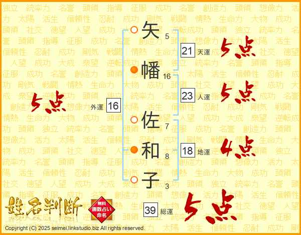 矢幡佐和子さんの総運は39画の5点!