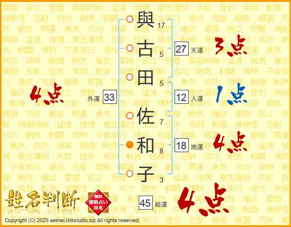 與(17画)古(5画)田(5画)  佐(7画)和(8画)子(3画)