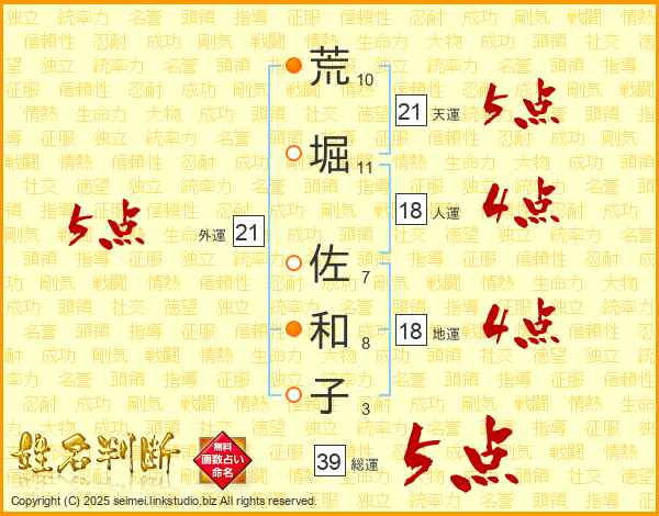 荒(10画)堀(11画) 佐(7画)和(8画)子(3画)