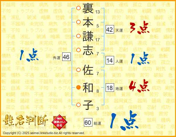 裏(13画)本(5画)謙(17画)志(7画) 佐(7画)和(8画)子(3画)